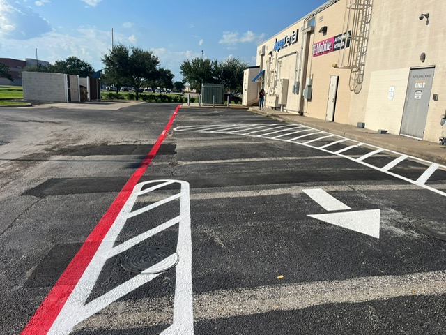 Precise pavement striping for parking lots and roadways. Improves traffic flow, visibility, and compliance.