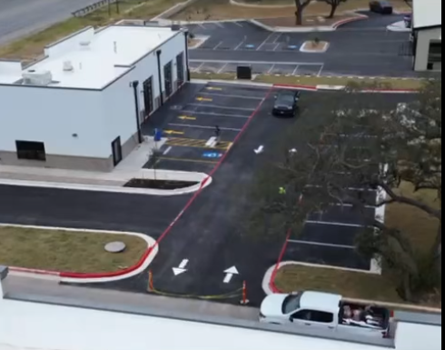 Full parking lot striping, ADA compliance, perimeter fire lane markings, and traffic flow installation for a commercial retail development in Hutto, Texas.